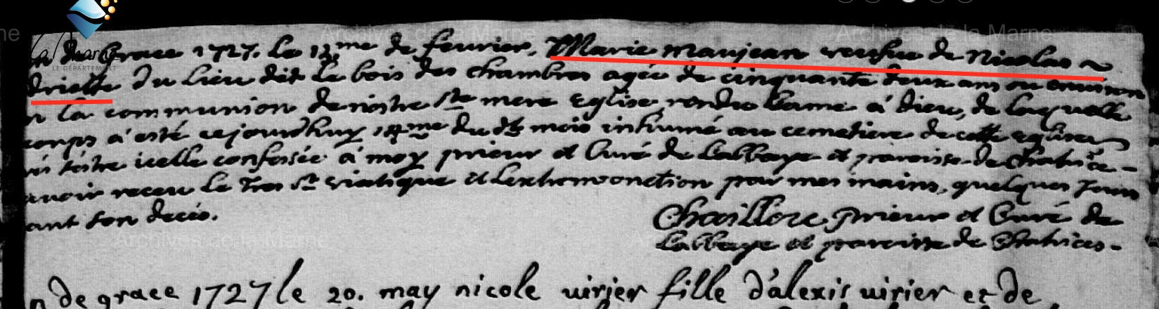 52 ans à son dcDécès : 12 février 1727 à Châtrices 51800 ( Source )