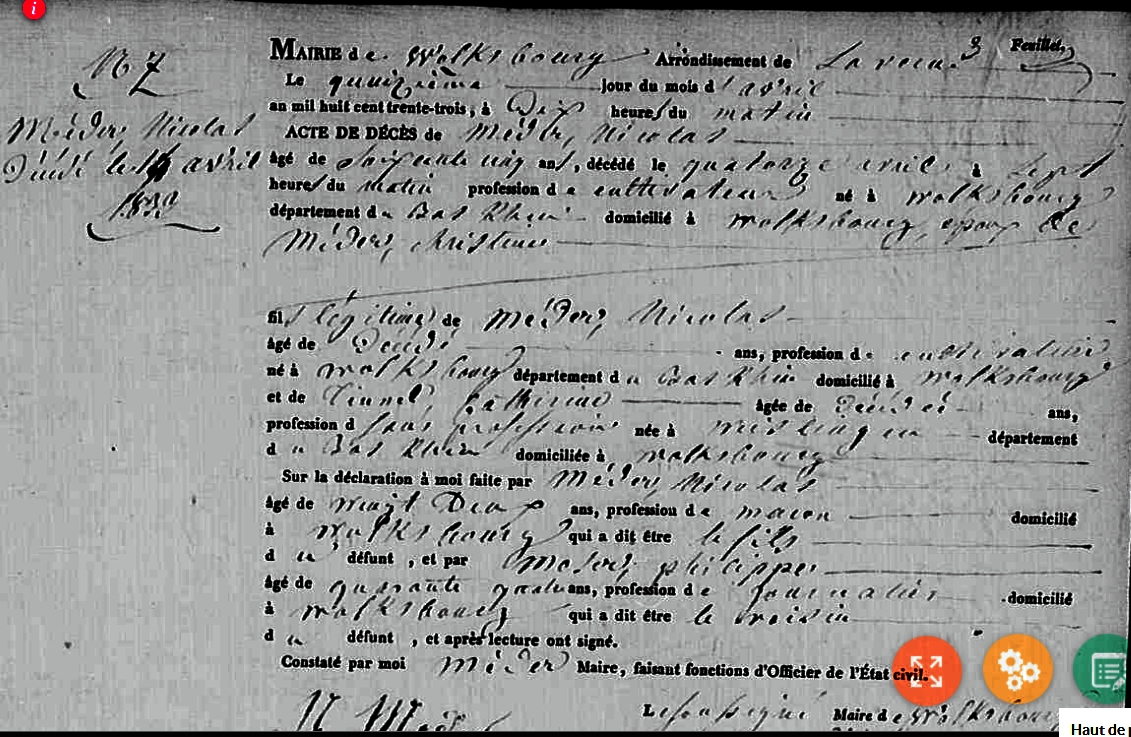 Pas registre avant 1772Décès : 14 avril 1833 à Volksberg 67290 Alsace ( Source )