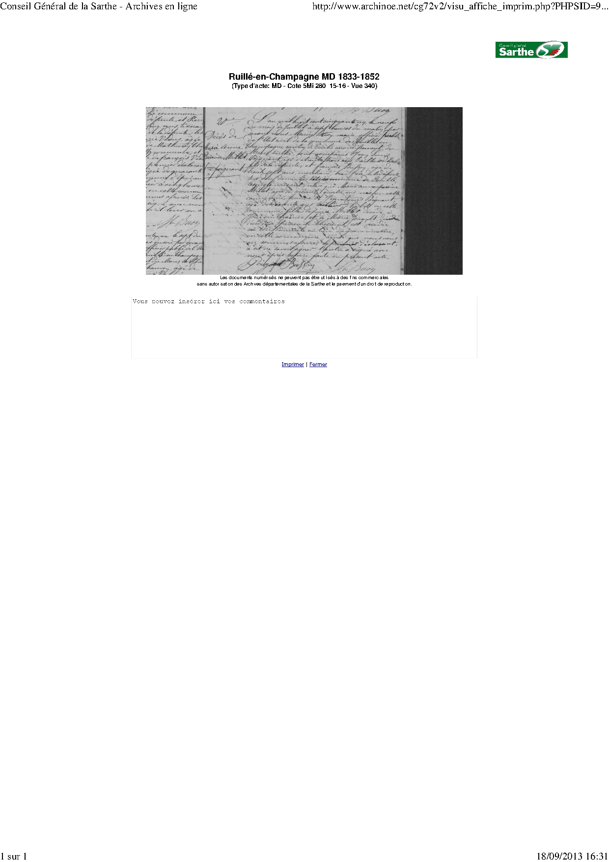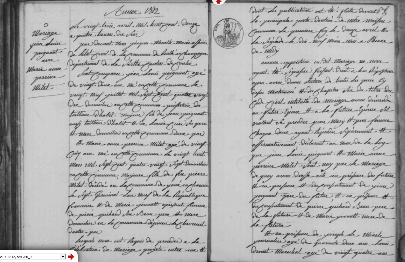 Mariage : 23 avril 1812 à Ruille en Champagne 72240 ( Source )