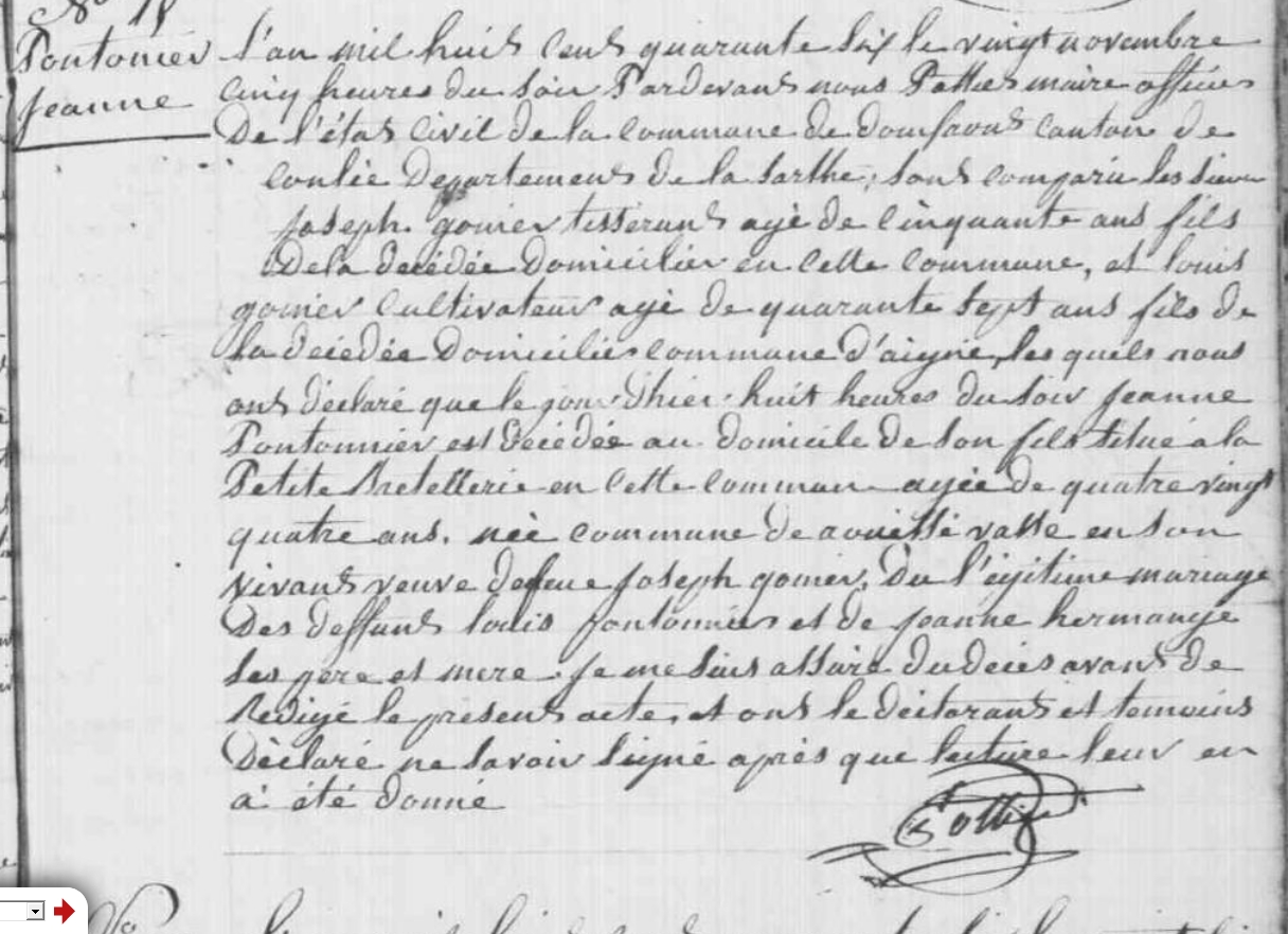 Décès : 19 novembre 1846 à Domfront-en-Champagne 72240 ( Source )