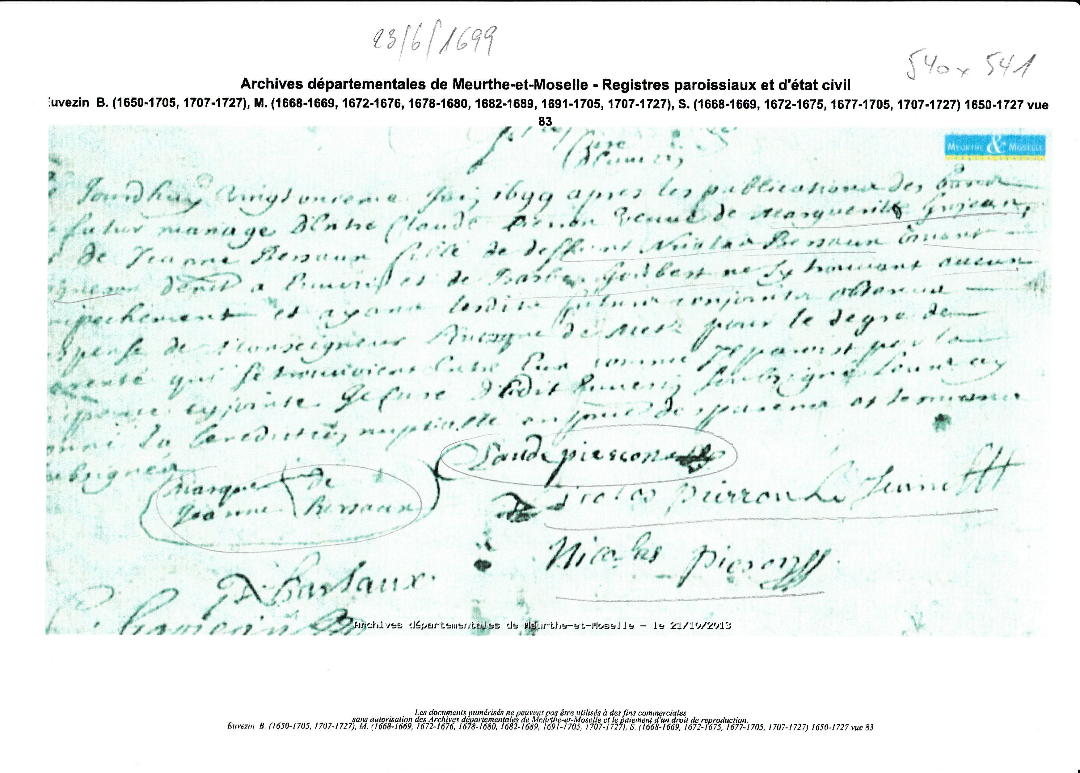 Mariage : 21 juin 1699 à Euvezin 54470 ( Source )