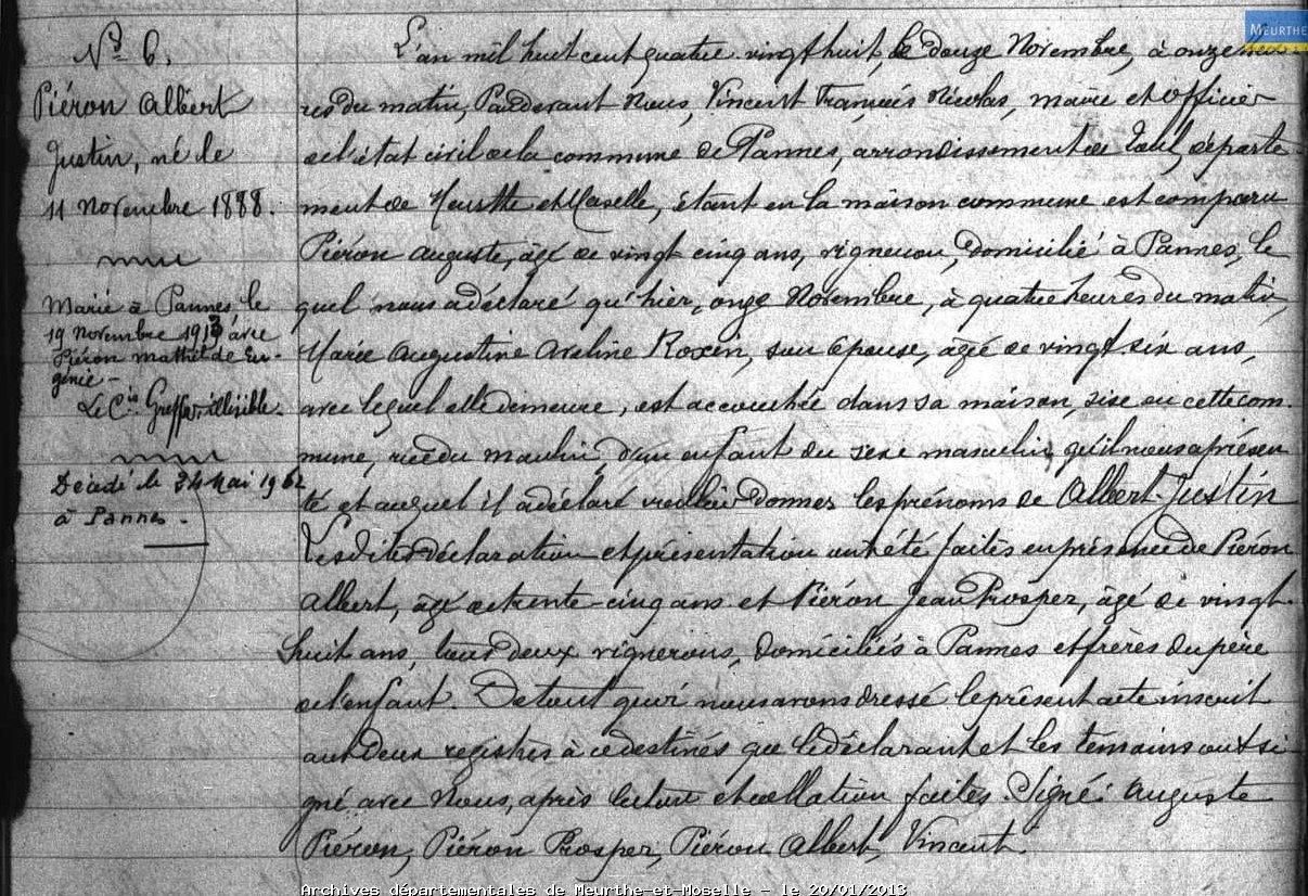 Naissance : 11 novembre 1888 à Pannes 54470 ( Source )