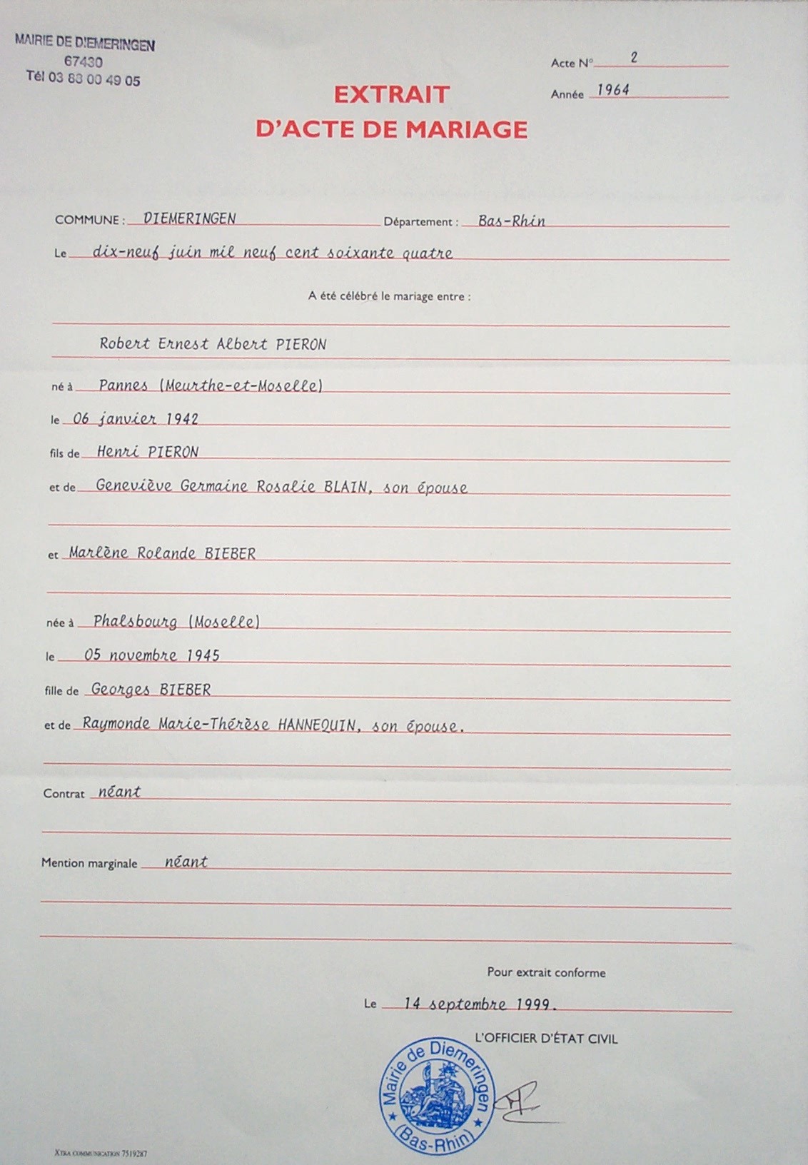 Mariage : 19 juin 1964 à Diemeringen 67430 ( Source )