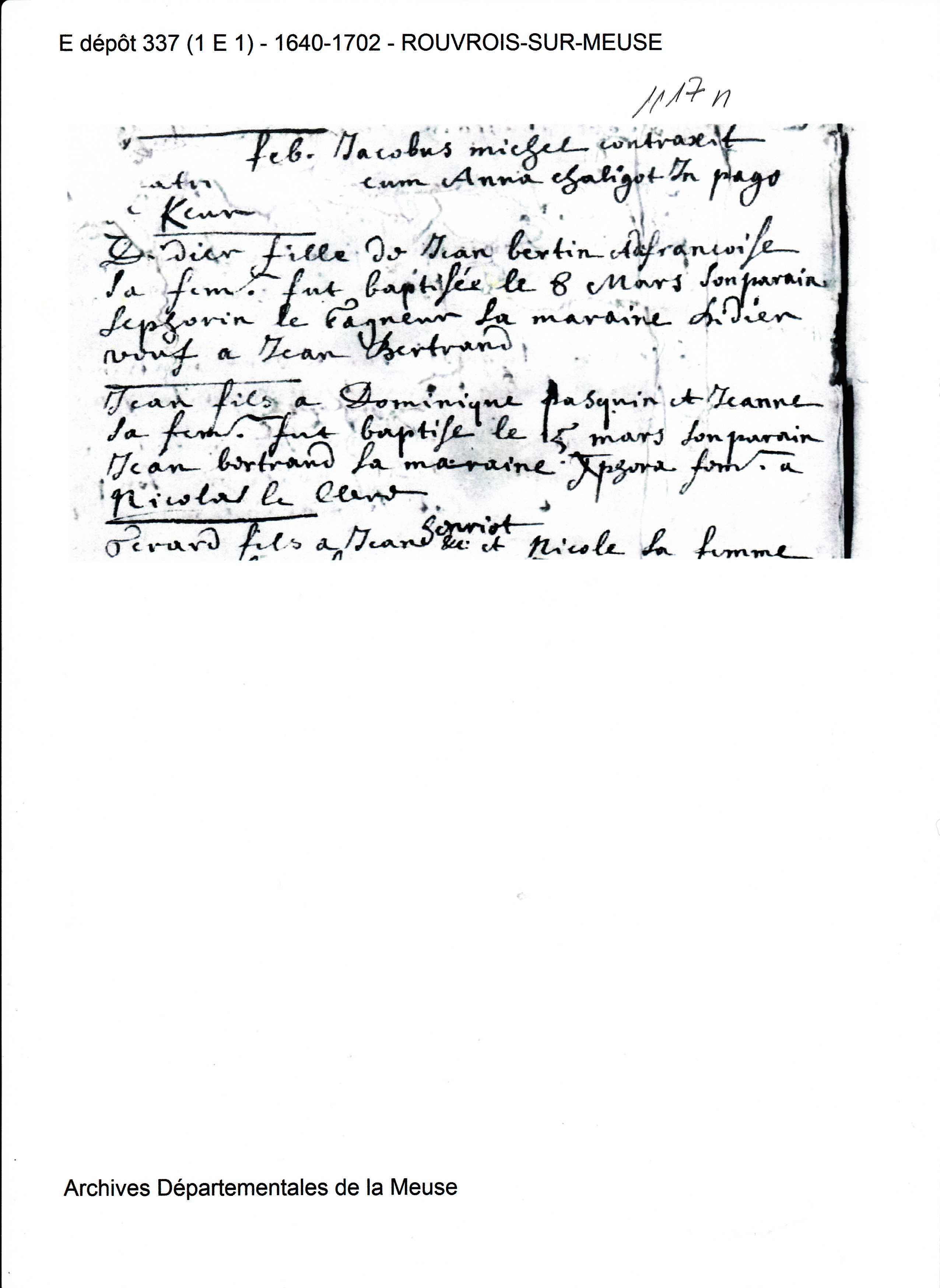 Naissance : 8 mars 1648 à Rouvrois sur Meuse 55300 ( Source )
