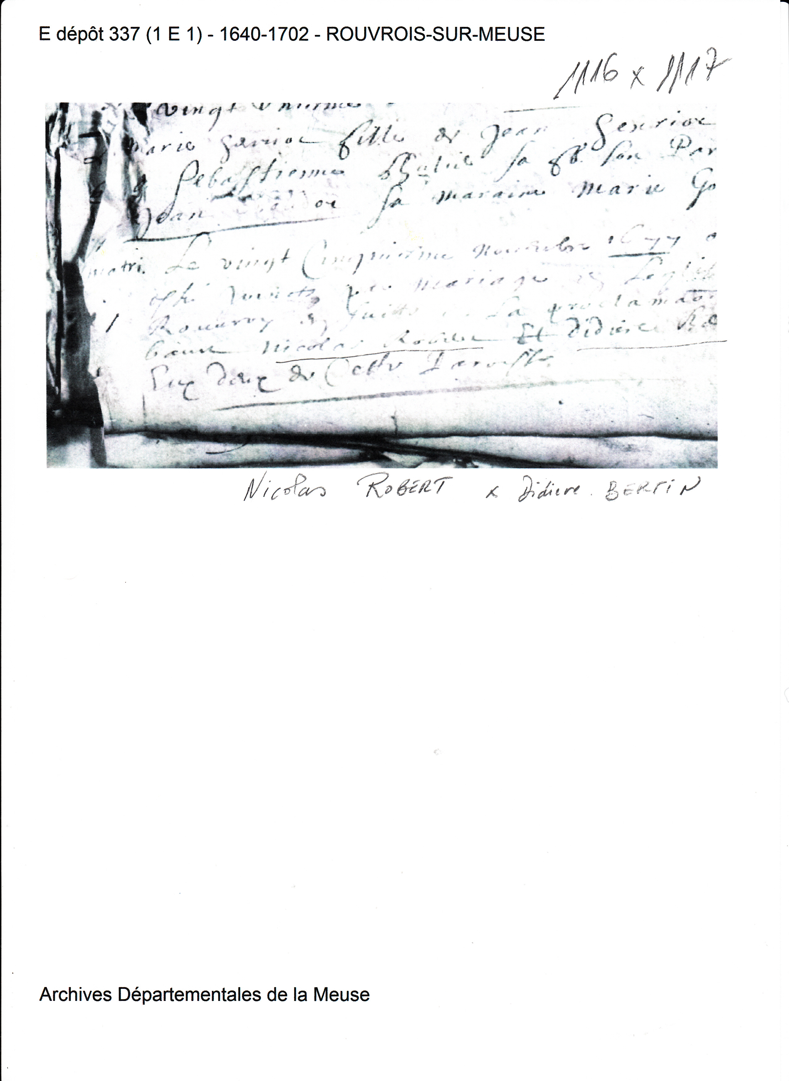 Mariage : 25 novembre 1677 à Rouvrois sur Meuse 55300 ( Source )