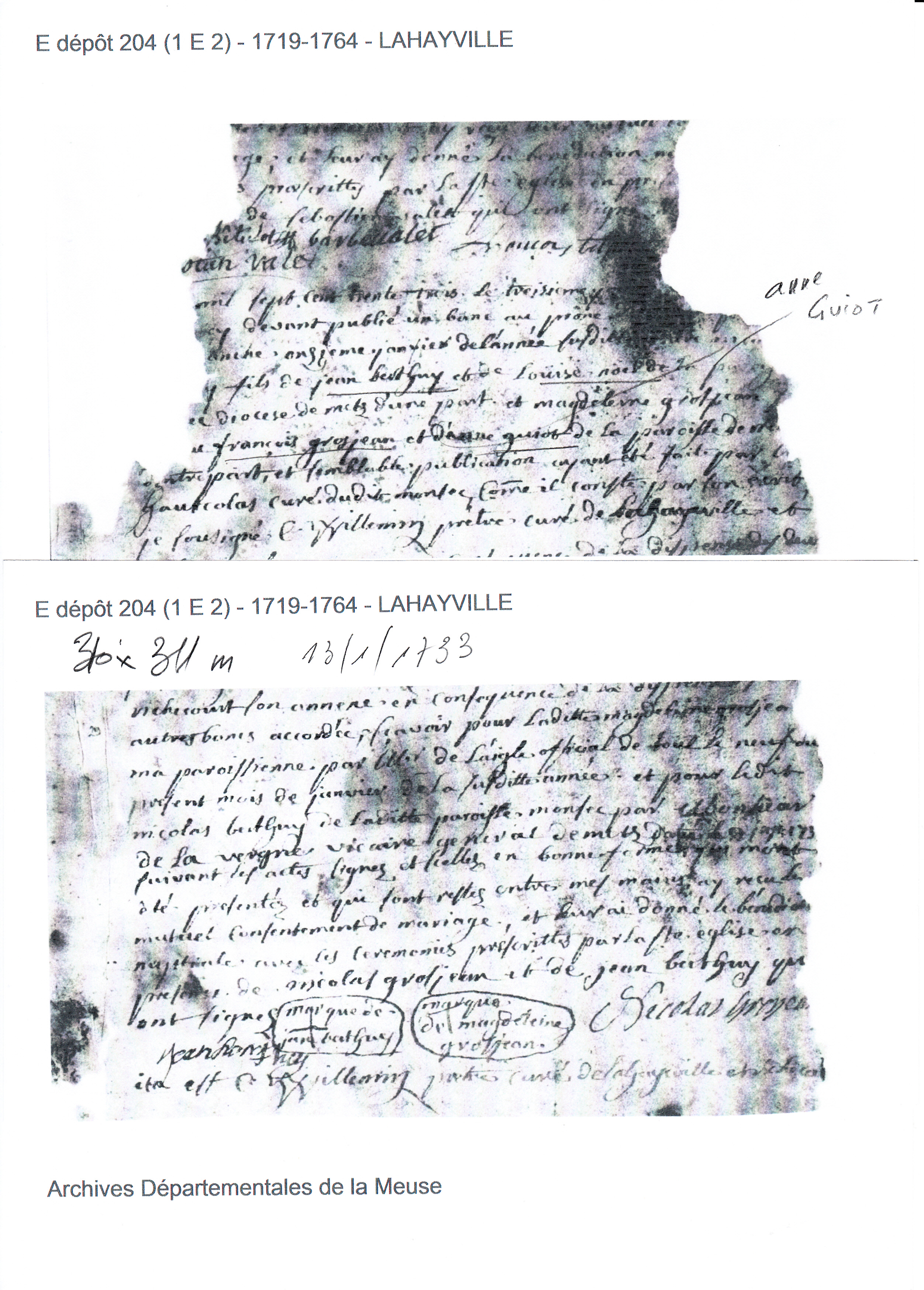 Mariage : 13 janvier 1733 à Lahayville 55300 ( Source )
