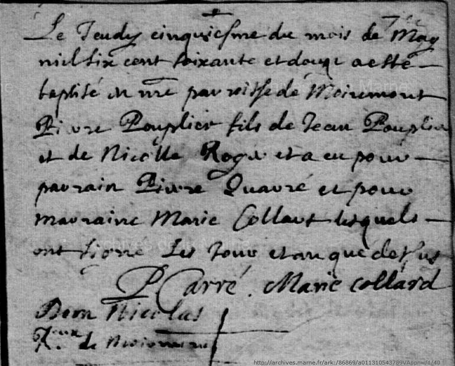 Naissance : 5 mai 1672 à Moiremont 51 ( Source )