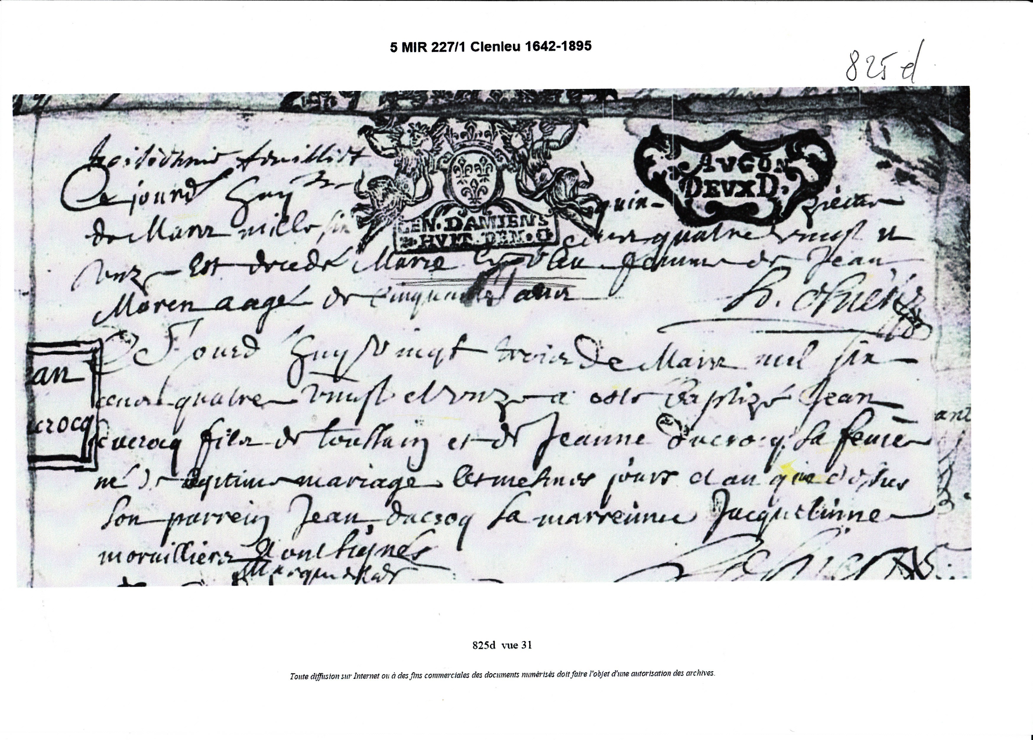 Naissance : vers 1635 à Doudeauville 62830 Décès : 22 mars 1691 à Clenleu 62650 ( Source )