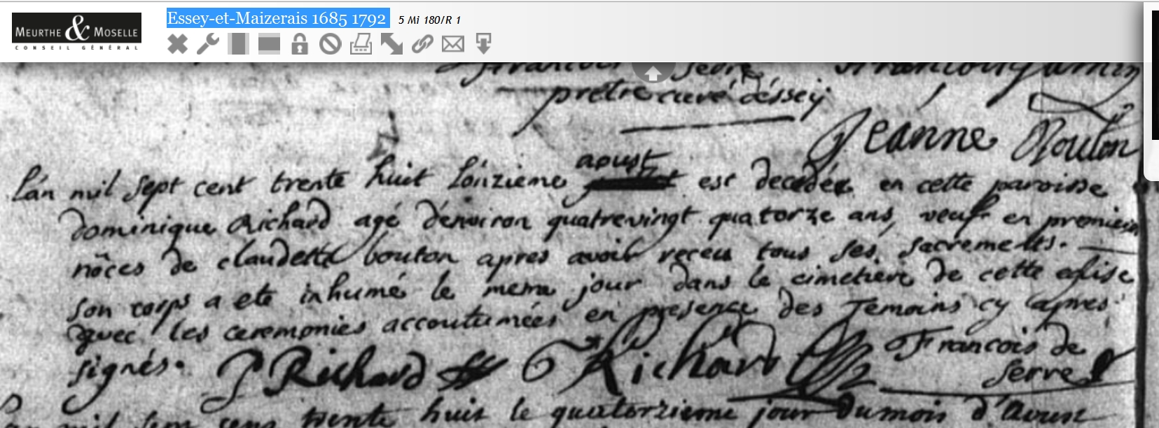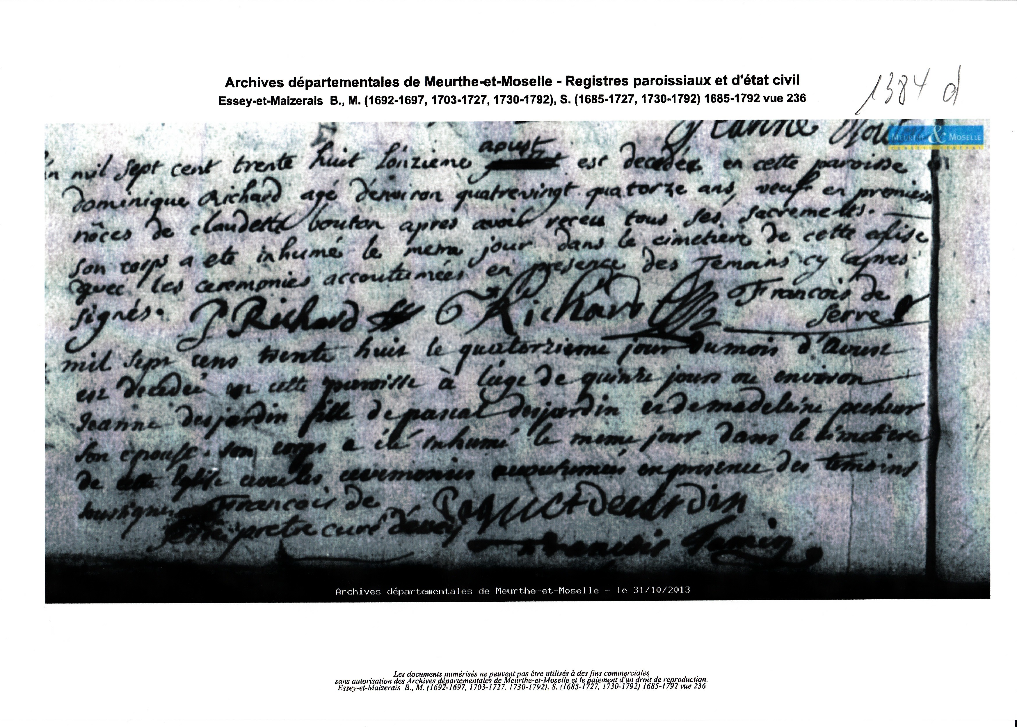 94 a son dcDécès : 11 août 1738 à Essey et Maizerais 54470 ( Source1 Source2 )