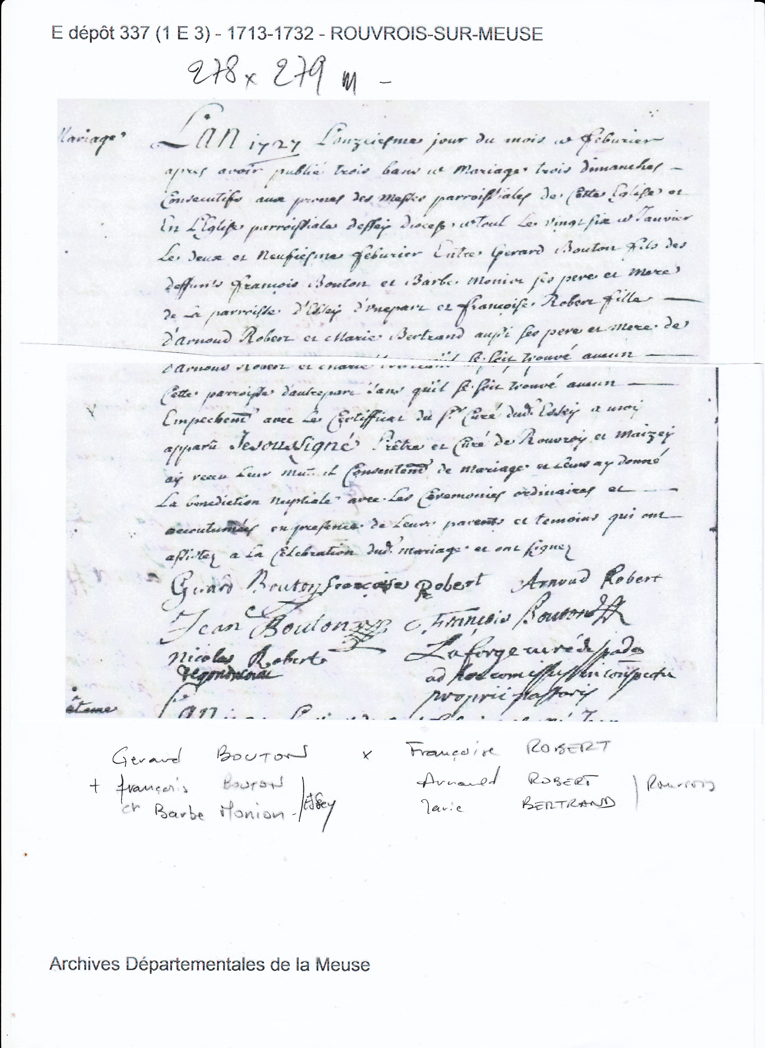 Mariage : 11 février 1727 à Rouvrois sur Meuse 55300 ( Source )