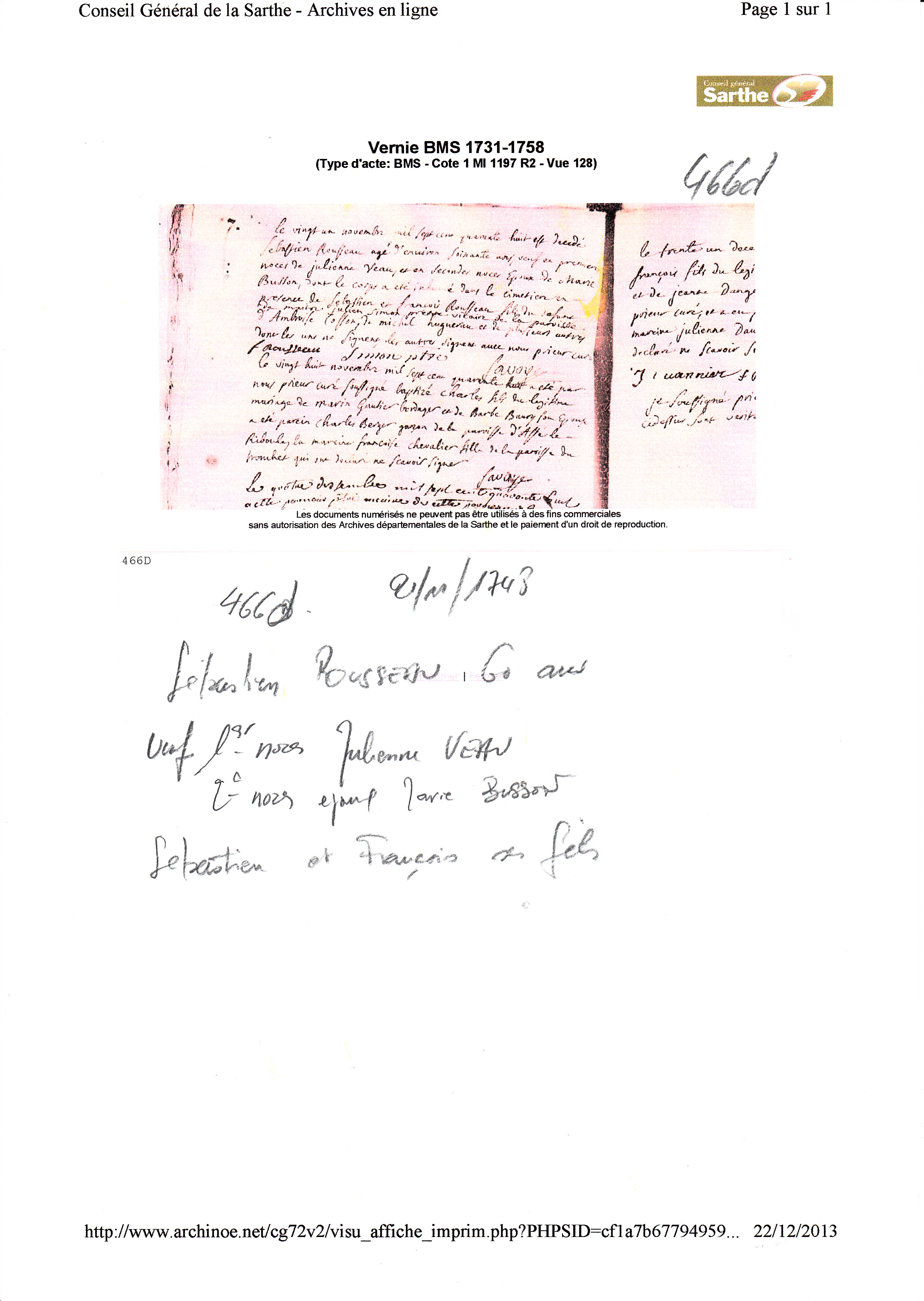 Décès : 21 novembre 1748 à Vernie 72170 ( Source )