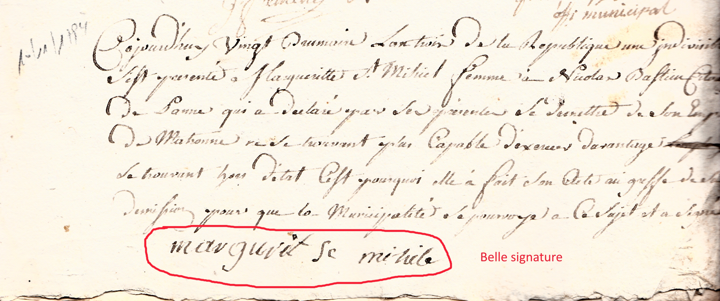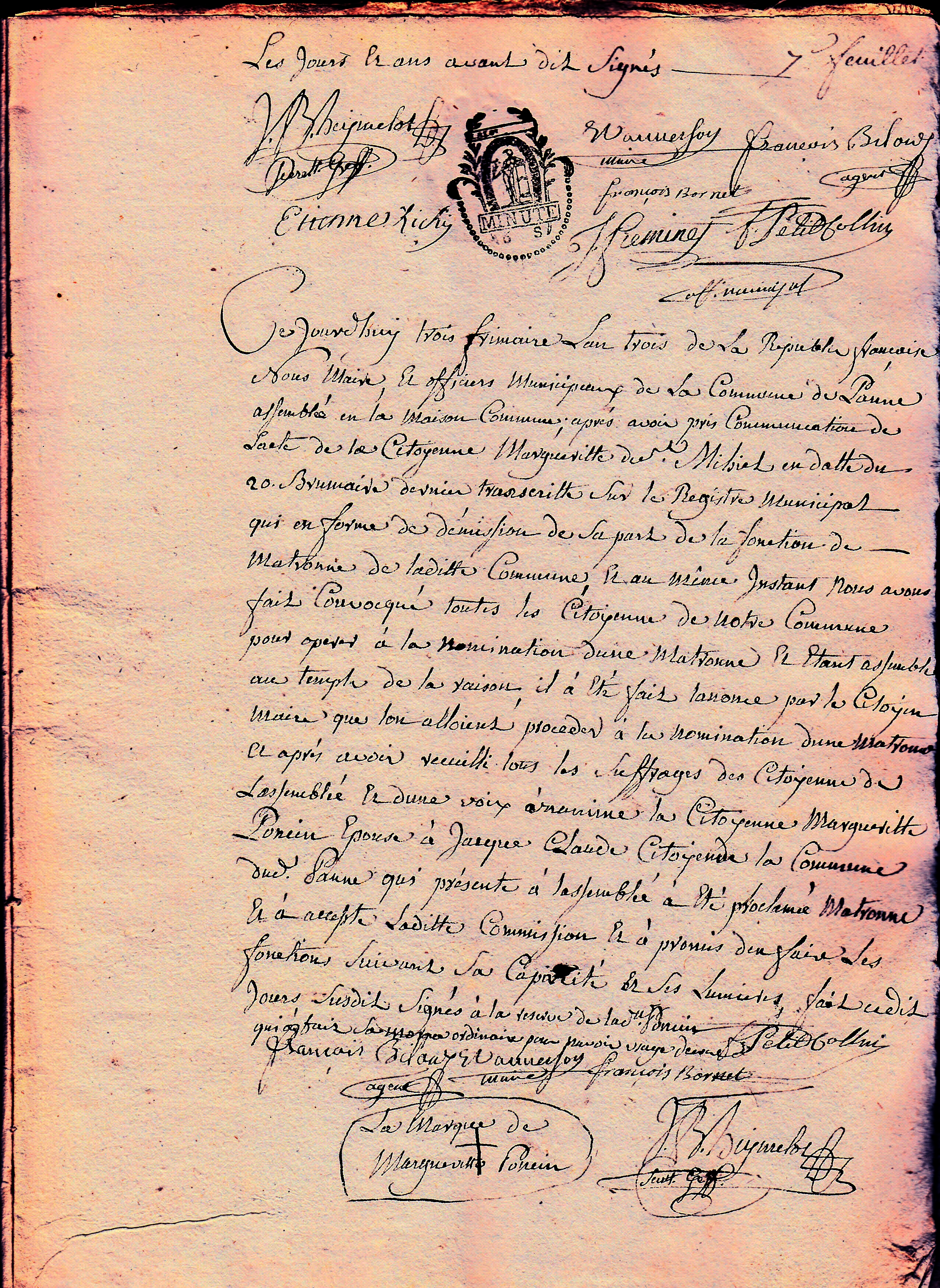 Le 10/11/1794, demissionne de sa fonction de matronne et est remplacée le 23/11/1794 par Margueritte PONCIN