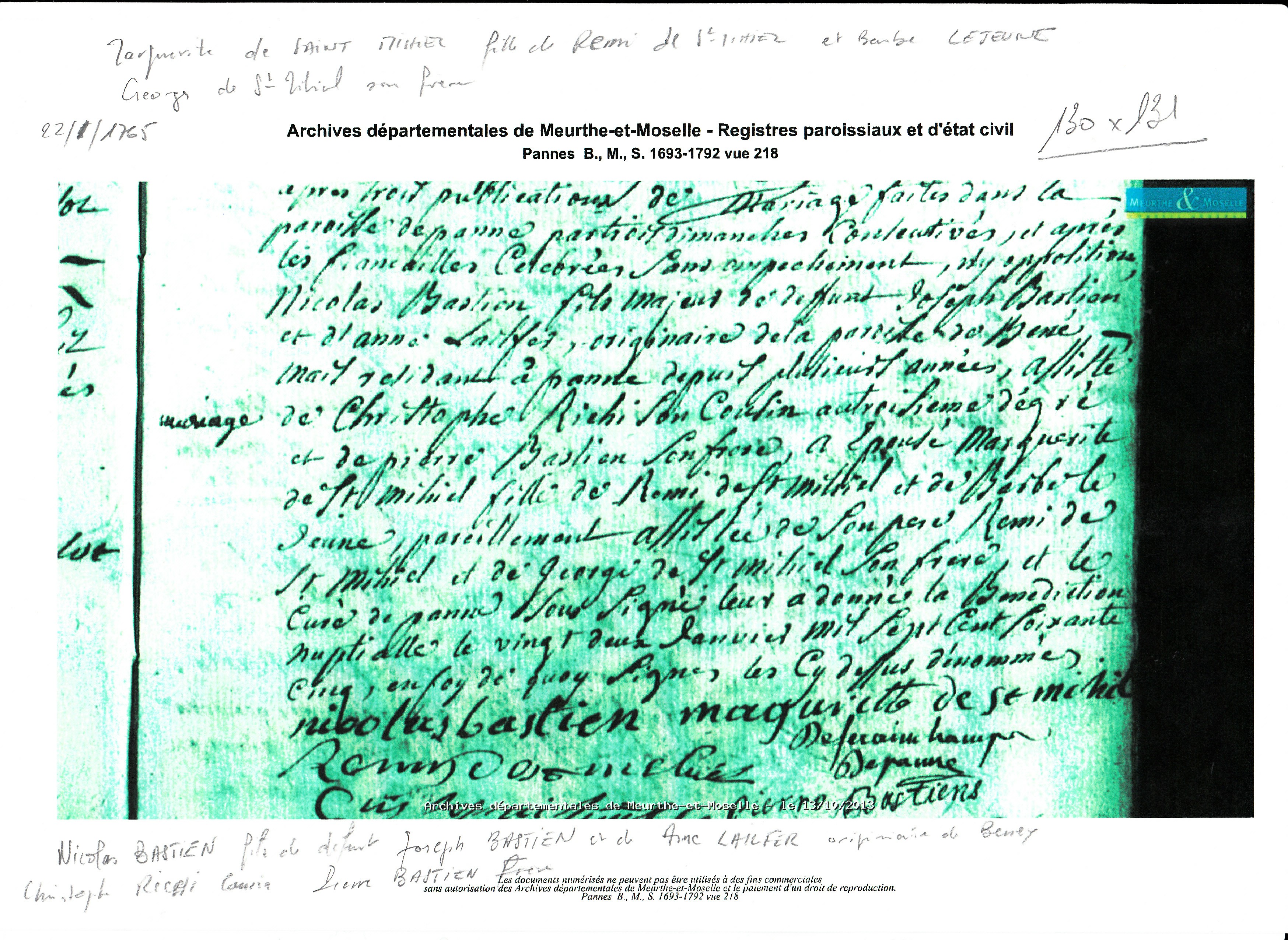Mariage : 22 janvier 1765 à Pannes 54470 ( Source )