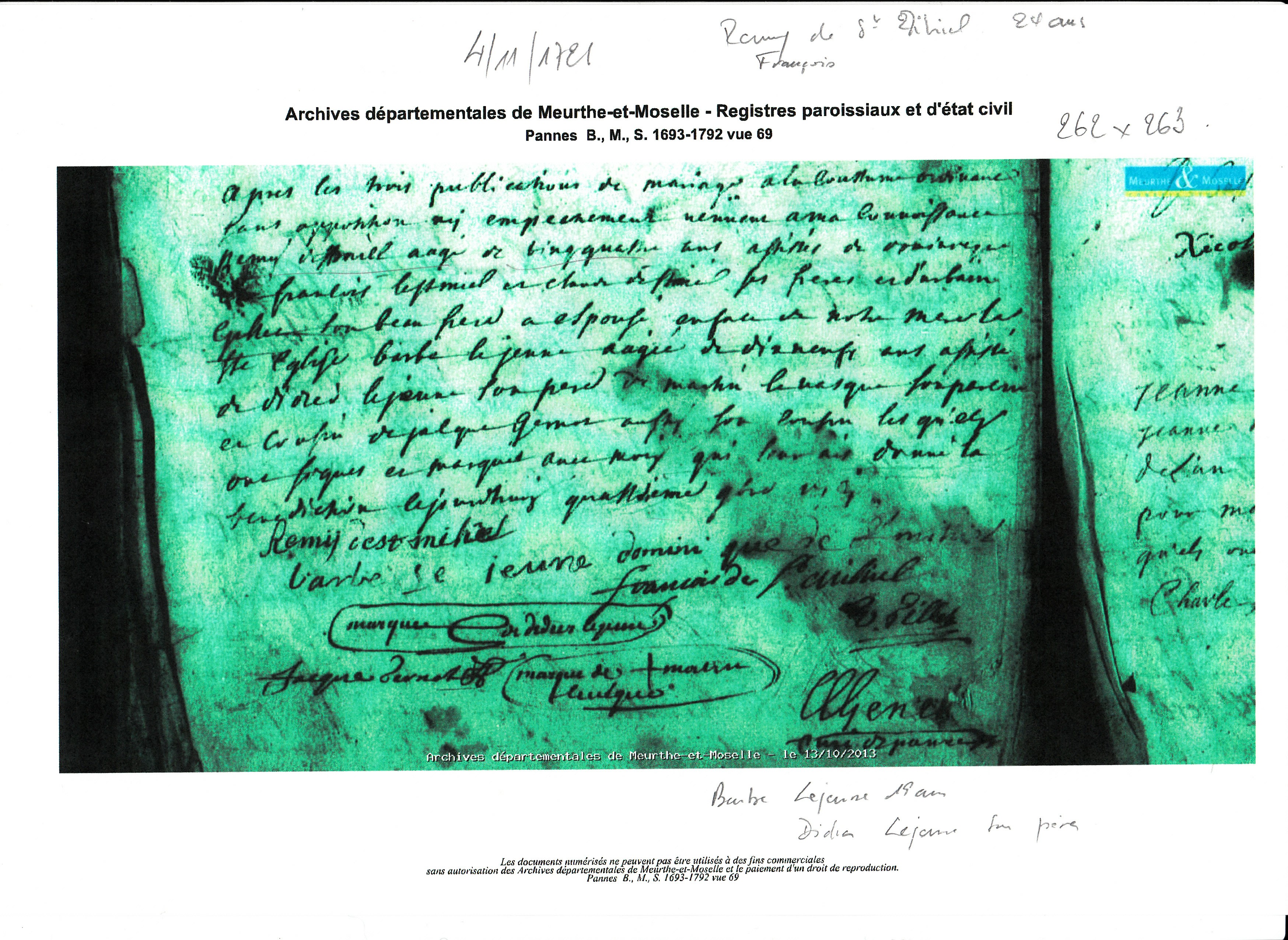 Mariage : 4 novembre 1721 à Pannes 54470 ( Source )